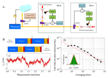 研究团队突破了镱原子光钟的多项关键技术,在黑体辐射频移的精准控制、直流Stark频移与原子碰撞频移的抑制、钟激光频率稳定度的改善等方面采取了系列创新措施,实现了光钟稳定度的大幅度提升,特别是采用了量子化轴方向与环境干扰磁场矢量相垂直的方案,大幅度地降低了钟跃迁对相关干扰的敏感度,使得该光钟能够在地铁干扰环境下仍然能够正常工作。钟跃迁的Rabi探询能够得到亚赫兹线宽的谱线。团队顺利获得同类光钟之间的反同步频率比对,测得该光钟的在4500秒内的频率稳定度达到5.4E-18。频率噪声分析表明,频率稳定度主要受限于Dick效应。