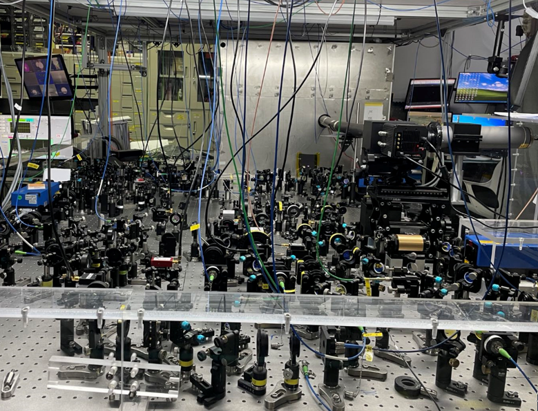 超冷40Ca+离子实验平台,囚禁离子的离子阱处于磁屏蔽装置(照片后方银白色金属箱)保护中,其余的光学设备用以辅助激光系统操作离子,完成量子热机所需的各个冲程