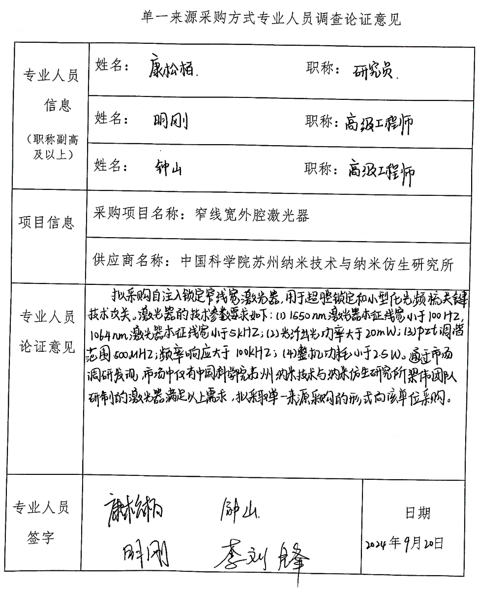 拟采购自注入锁定窄线宽激光器,用于超腔锁定和小型化光频梳关键技术攻关。激光器技术参数要求如下:(1)1550nm激光器本征线宽小于100Hz,1064nm激光器本征线宽小于5kHz;(2)光纤出光功率大于20mW;(3)pzt调谐范围500MHz,频率响应大于100kHz;(4)整机功耗小于2.5W。顺利获得市场调研发现,市场仅中国科研实验室苏州纳米技术与纳米仿生研究所梁伟团队研制的激光器满足以上需求,拟采取单一来源采购的形式向该单位采购。