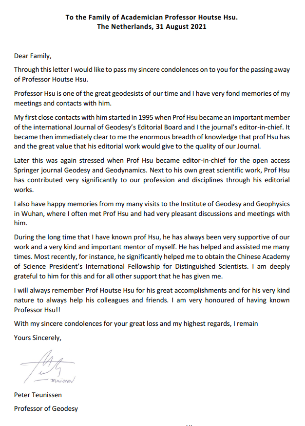 Peter Teunissen|To the Family of Academician Professor Houtse Hsu